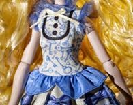 У девочки замечательные светлые волосы, голубые глаза и милое голубое платье в ретро стиле, а на юбке рисунки медведей....